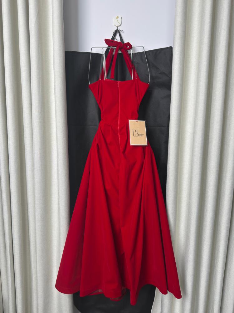 وصف المنتج: فستان ناعم أنيق مصنوع من قماش مخمل جوخ يتميز بتصميم فريد وأنيق يبرز جمال قوامك، ومثالي للمناسبات الخاصة.
