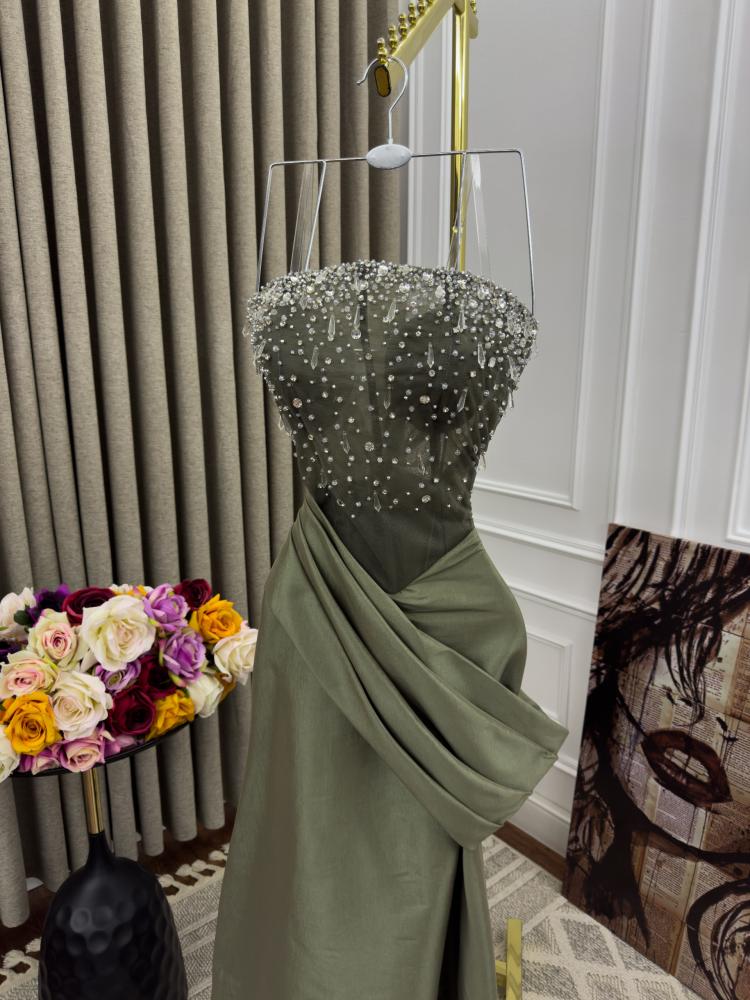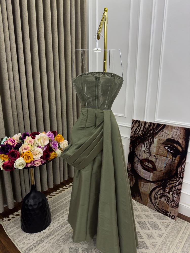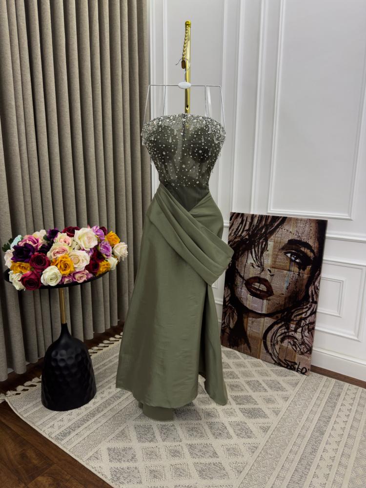 وصف المنتج: فستان سهره أنيق مصنوع من قماش زيتوني يتميز بتصميم فريد وأنيق يبرز جمال قوامك، ومثالي للمناسبات الخاصة.