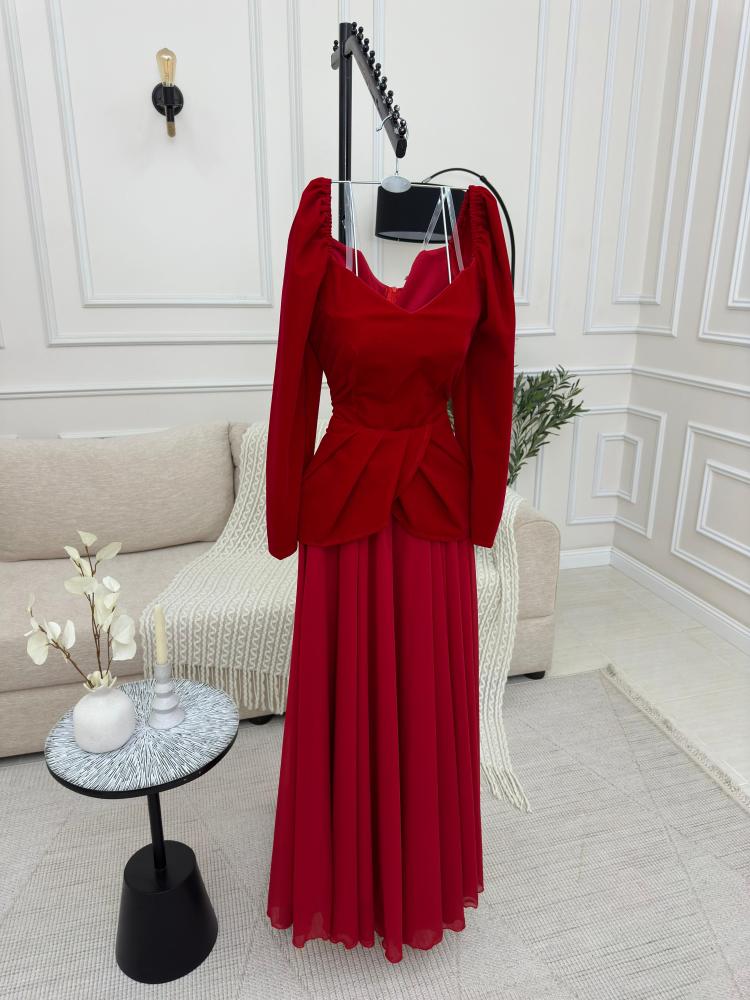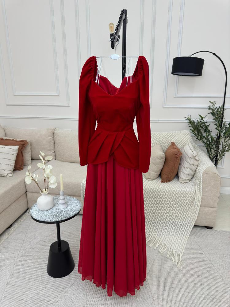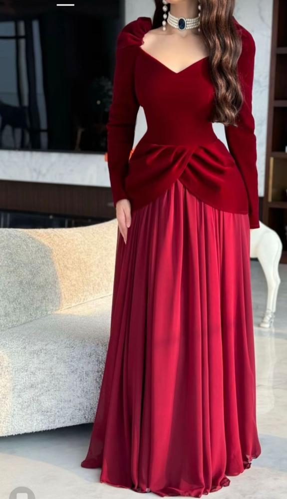 وصف المنتج: فستان ناعم أنيق مصنوع من قماش جوخ يتميز بتصميم فريد وأنيق يبرز جمال قوامك، ومثالي للمناسبات الخاصة.
